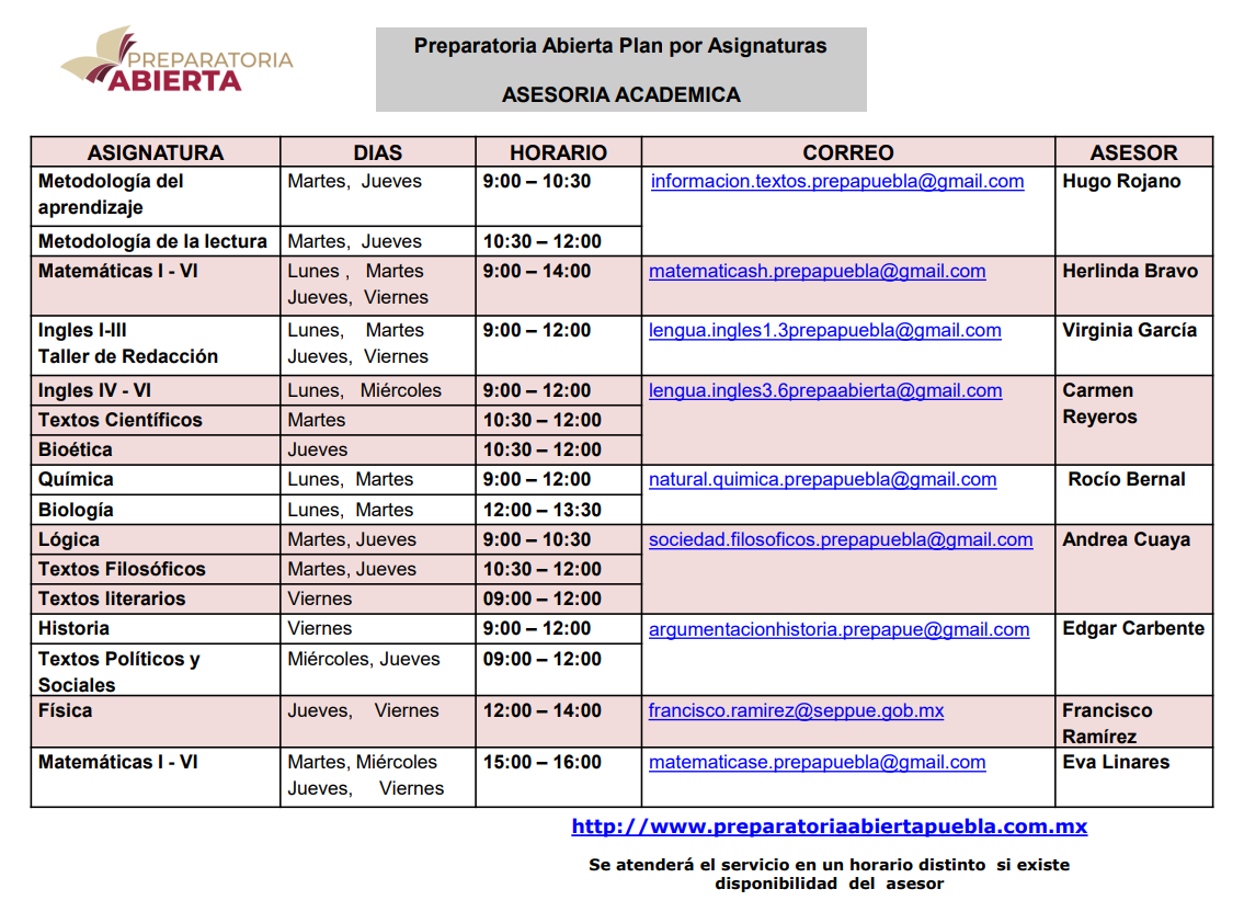 Servicios Académicos Horario de Asesoría Académica Plan por Asignaturas Hugo Rojanoinformacion.textos.prepapuebla@gmail.com Herlinda Bravomatematicash.prepapuebla@gmail.com Virginia Garcíalengua.ingles1.3prepapuebla@gmail.com Carmen Reyeroslengua.ingles3.6prepaabierta@gmail.com Rocío Bernalnatural.quimica.prepapuebla@gmail.com Andrea Cuayasociedad.filosoficos.prepapuebla@gmail.com Edgar Carbenteargumentacionhistoria.prepapue@gmail.com Sergio Gómezdinamica.fisica.prepapuebla@gmail.com Eva Linaresmatematicase.prepapuebla@gmail.com